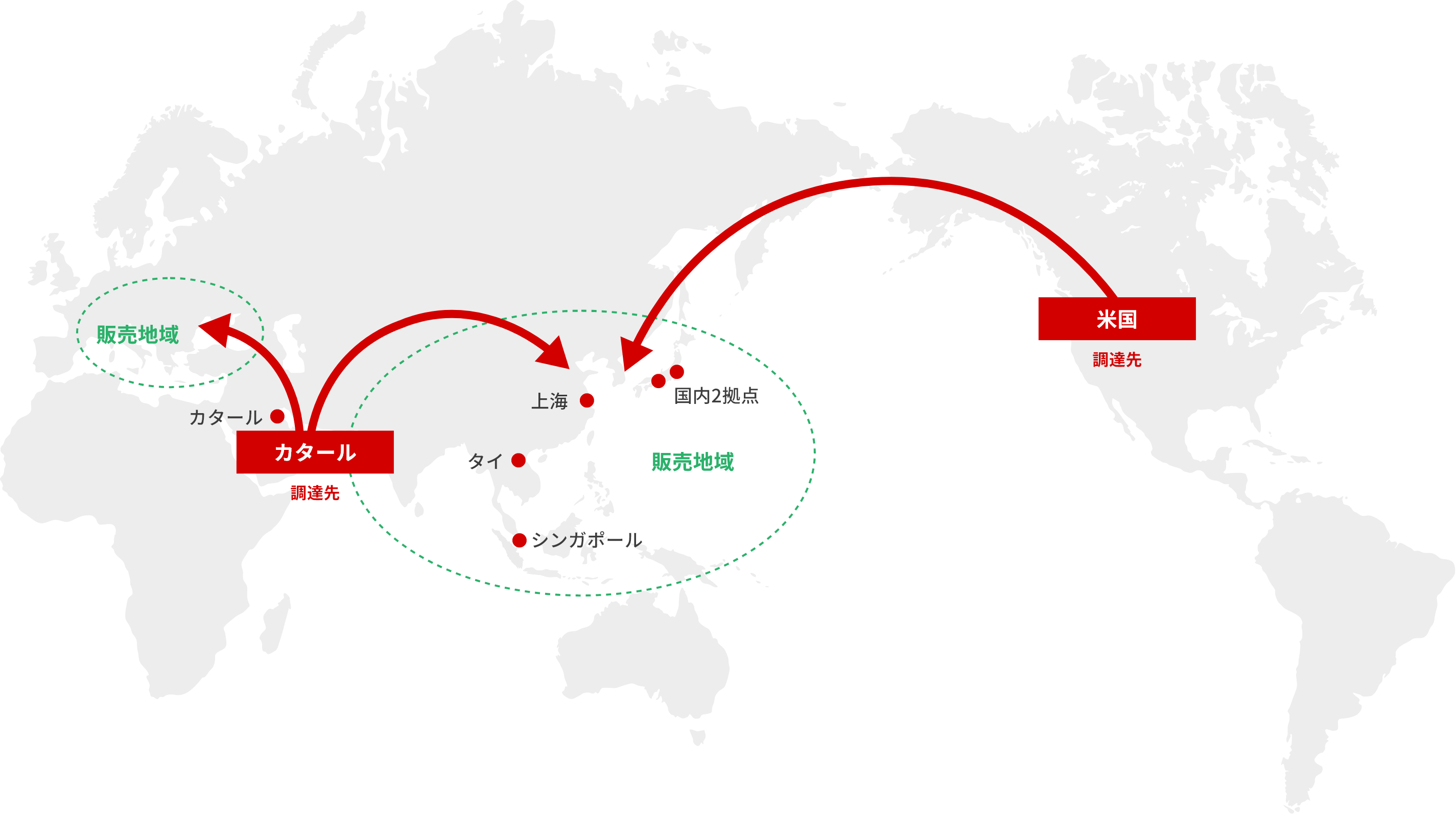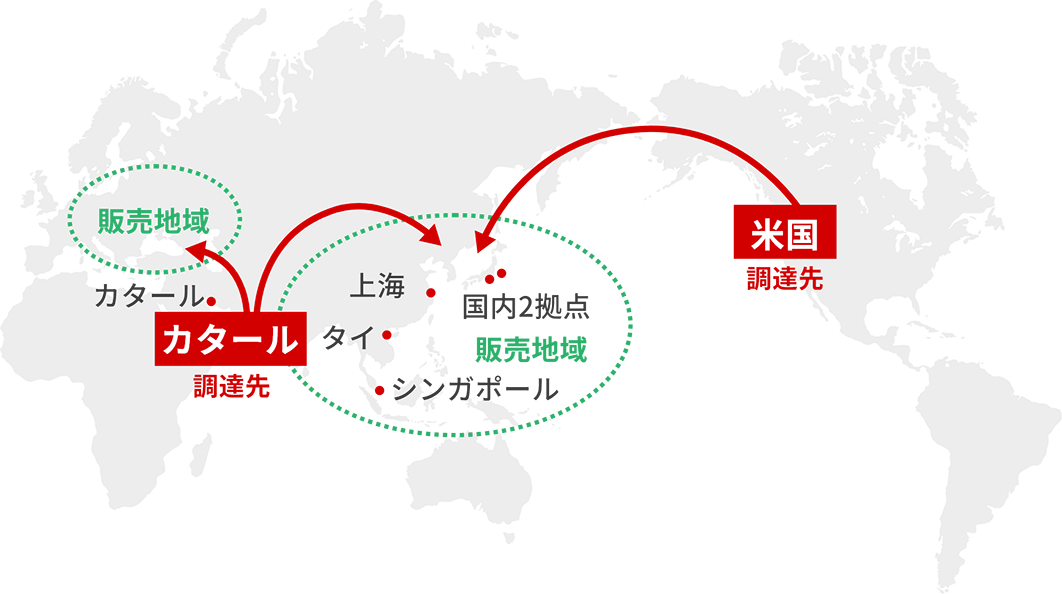 イワタニは直輸入権益を得たカタールおよび米国の2ヵ国から「ダブルソース」による安定調達により、安定供給を実現しています。また、トップシェアを占める日本市場だけでなく、中国・東南アジアでの販売に力を入れています。ヘリウムの需要が国内外で伸びる中、イワタニは「大阪ヘリウムセンター」と並び、国内最大級の規模を誇る「東京ヘリウムセンター」を2019年に新設しました。また、海外では、中国、シンガポール、タイ、カタールに製造拠点を有しています。